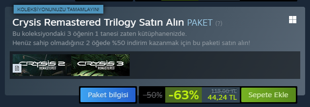 Crysis 1'e sahipseniz 44,24₺ gibi bir fiyata alabiliyorsunuz. Hiçbirine sahip değilseniz 56,74₺.