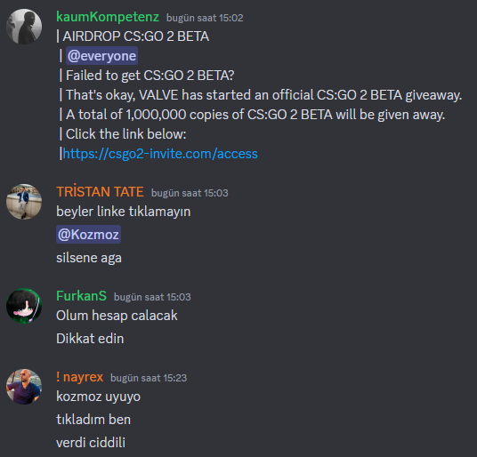 Merhaba. Discord'da birisi CS 2 beta için bir link attı dolandırıcı olduğunu düşünüyorum. Linke tıklarsam Steam hesabım çalınacak yüksek ihtimal. Sizin de haberiniz olsun dikkat edin.