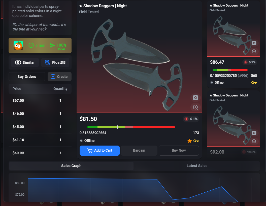 Bıçak almayı düşünüyorum. ByNoGame yüklerken falan çok komisyon alıyor. "csfloat.com" diye bir sitede Shadow Daggers Night FT'yi 81$'a satıyorlar. Güvenilir site mi ya da daha ucuza alabileceğim yer var mı?