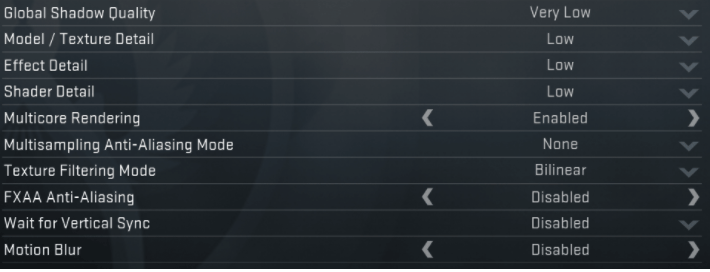 Ayarlar kısmının arkaplanı nasıl eski CS:GO olarak gözüküyor?Kanka ben hepsini en düşükte kullanıyorum ama bunun sebebi FPS değil; gözümün gereksiz detaylara takılmaması için ki 2015'ten beri ayarlarım böyle. 4:3 oynadıktan sonra hitbody oranı zaten 16:9'a göre artacaktır ama 4:3'ten 4:3'e geçmen bu oranı değiştirmez. 800x600'e geçersen de o çözünürlüğü uzun bir süre bırakma.