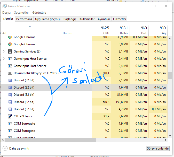 Öncelikle görev yöneticisi açarak tüm Discord instancelarını arkaplandan kapatmalısın.