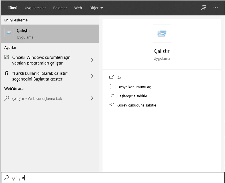 Daha sonra arama kısmına Çalıştır (Windows'u İngilizce kullanıyorsan Run) yaz ve çıkanı aç.