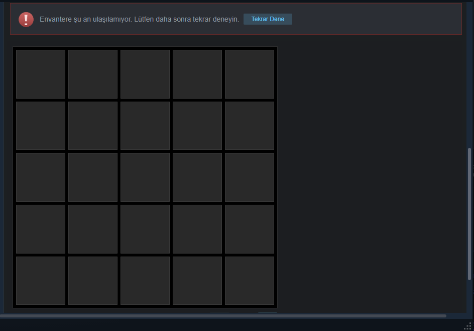 CS:GO'da örneğin envanterde bir şeye sağ tıklayıp satmak istesem envantere ulaşılamıyor diyor, tekrar dene tuşuna basınca düzeliyor ama silah skinlerinin ve diğer eşyalarının görselleri yok. Bunu nasıl çözerim? (üstüne fareu getirip sol tıklayarak ne olduğunu görebiliyorum.)