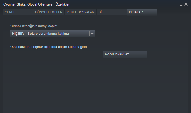 Arkadaşlar merhaba. CS:GO'da hiç beta modunu kullanmamıştım. Kütüphane -> CS:GO -> Özellikler ->Betalar kısmında 1.37.5.8 altında 1.37.5.9 onun altında ise yazılı bir beta vardı.