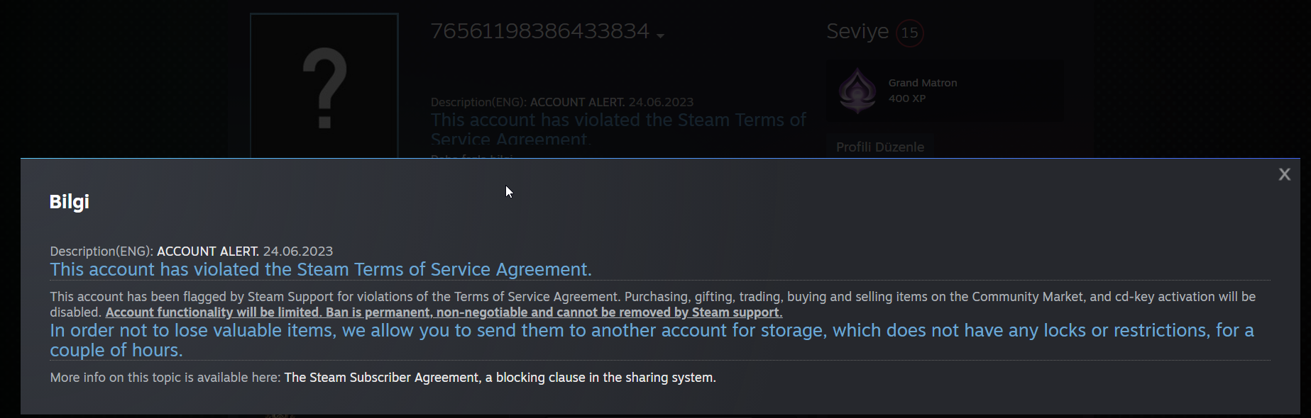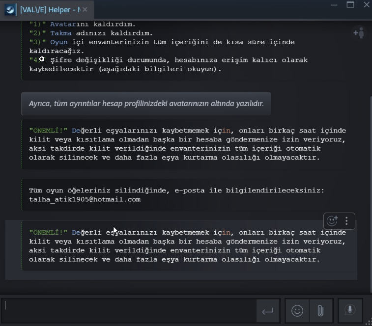 mesajlardan gördüğünüz üzere eşyaları başka bir hesaba göndermem için beni tetikliyordu. Oysa hesapta bir sıkıntı olsa eşyaları almam için bana süre vermez hesabı direk kapatırlar. Bu telaşla steam api key i kontrol etmeden skinlerimi göndermeye çalışsaydım direk gidecekti skinlerim. Aynı zamanda bu süre zarfında steam adım ve açıklaması değişti.