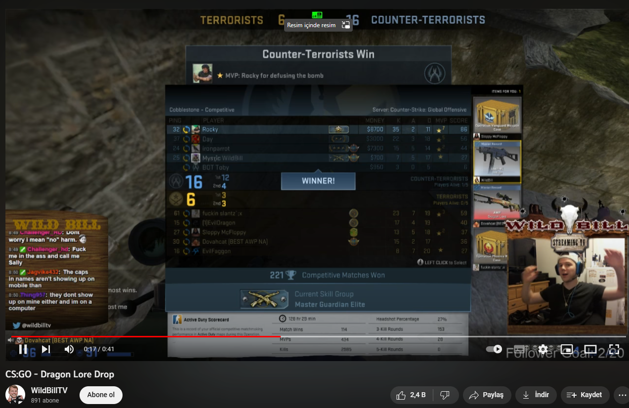 Görseldeki çok eski bir video (8 yıl önce), bilmiyorum gerçek mi ama mor silah düşüren birkaç kişiye şahsen denk gelmiştim ben. (görseldeki düşen kırmızı AWP Dragon lore ve değeri acayip yüksek)