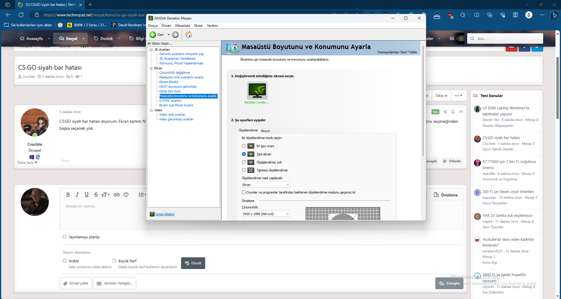 CS:GO siyah bar hatası alıyorum. Ekran kartım NVIDIA, işlemcim Intel. İkisinin de programlarından ölçeklendirme değiştrirmeyi denedim. NVIDIA'da ölçeklenme ayarlanmıyor, Intel'de ekran ölçeklenmesini koru seçeneğinden başka seçenek yok.