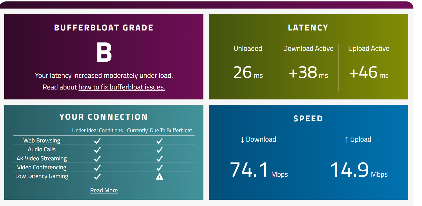 Dediğim testi yapın hocam Bufferbloat o kadar kanser bir şey ki 120 ping Bufferbloatsız 60 ping Bufferbloatlıdan daha akıcı oluyor.