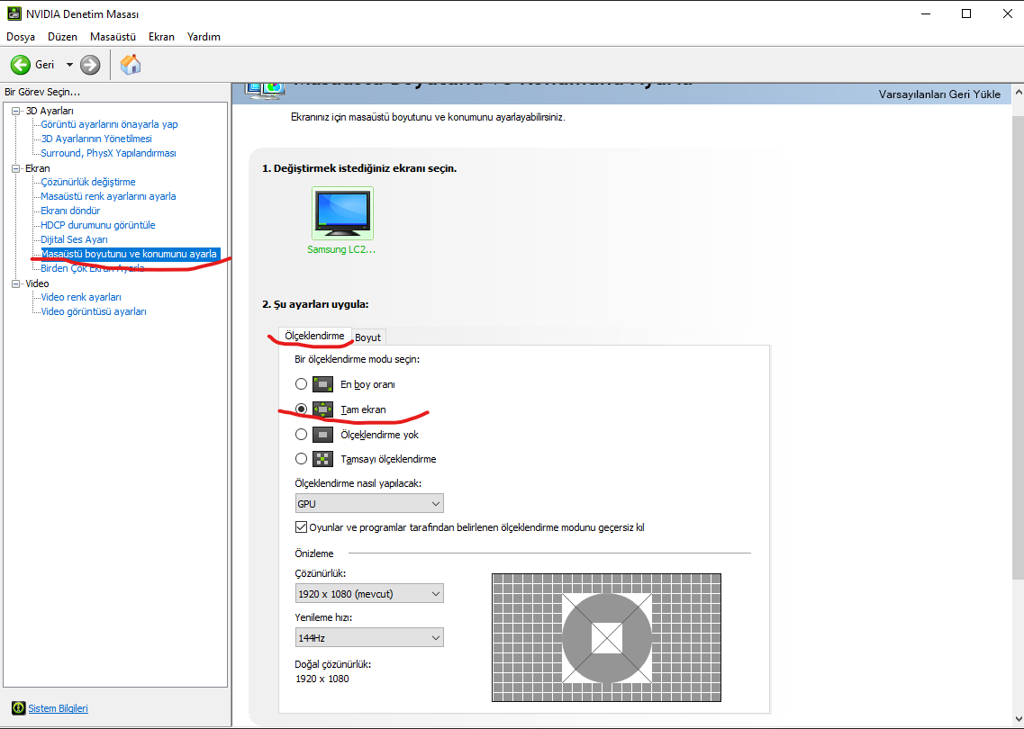 Denetim masası> masaüstü konumunu ve boyutunu ayarla> ölçeklendirme> tam ekran.