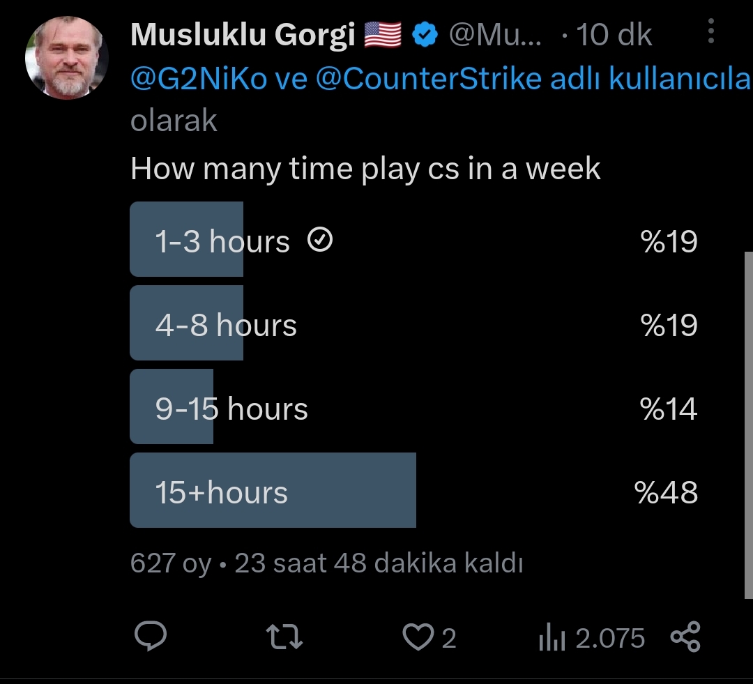 Haftada kaç saat CS oynuyorsunuz diye anket açmışlar. Çok normal dünyanın en çok oynanan oyunlarından biri. Ben şahsen 4-15 saat arası oynuyorum. İş yoğunluğuma göre değişiyor.