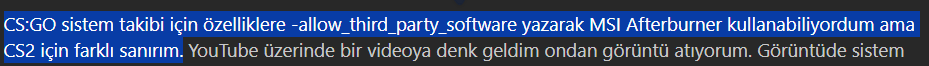 CS:GO sistem takibi için özelliklere -allow_third_party_software yazarak MSI Afterburner kullanabiliyordum ama CS2 için farklı sanırım. YouTube üzerinde bir videoya denk geldim ondan görüntü atıyorum. Görüntüde sistem takibi için hangi program hangi ayarlarla kullanılmış yardımcı olabilen varsa sevinirim.