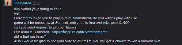 Merhaba. CS2'de maç girmiştim. Sonra bitti bir 2 saat sonra adamın bana arkadaşlık gönderdigini gördüm kabul ettim ve bana dedi ki "Google çeviriden Türkçeye çevirdim." Bu arada link o yazıda.