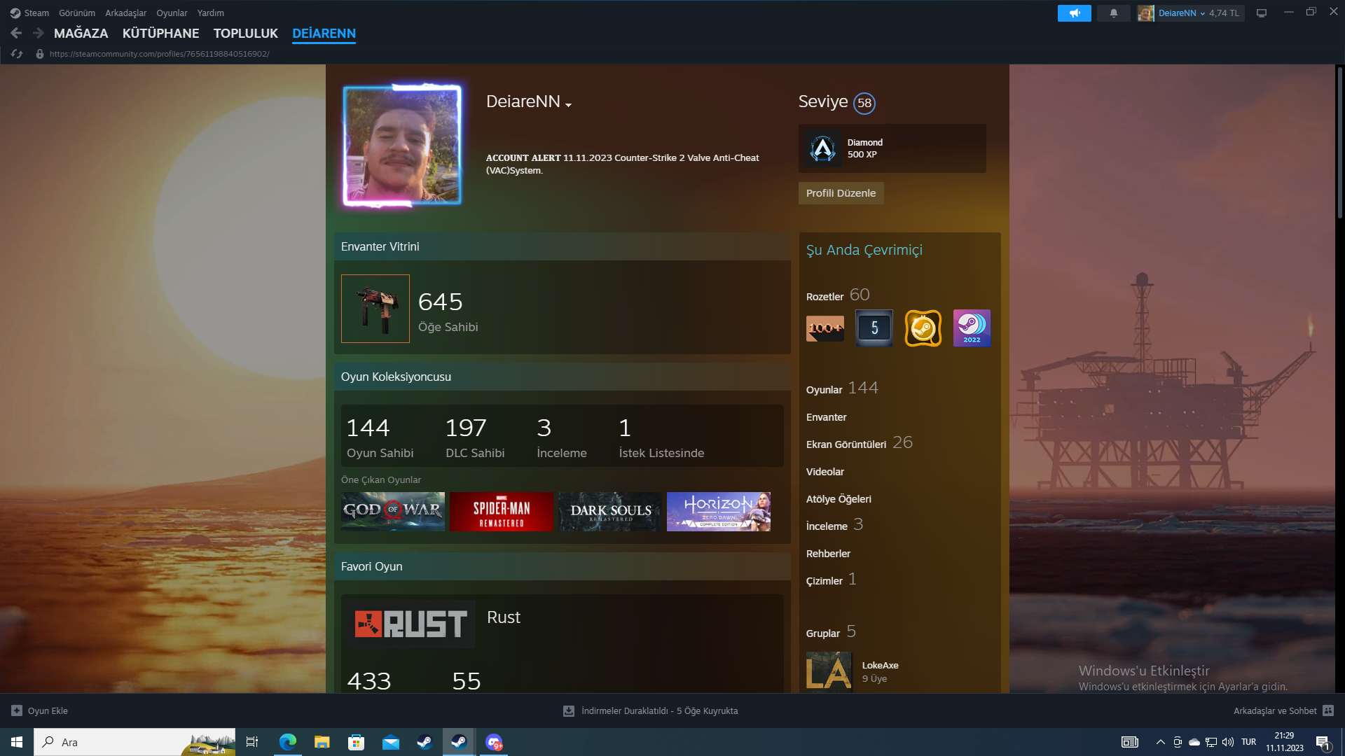 Arkadaşlar merhaba. Geçen hafta cuma günü askerden geldim. Cumartesi günü bilgisayarı formatladım. Pazartesi akşamı bilgisayara sadece CS yükleyip oyuna girdim 4 el seçkin oynadım. Bugün girdiğimde Steam'den yarım saat içinde ban yiyeceğime dair bir mesaj geldi yarım saat sonra oyuna girdiğimde hesabım artık seçkin değildi başına böyle bir şey gelen var mı ve profilimde açıklamada bu yazı var Steam ismim rastgele sayılar olarak sürekli değişiyordu. Profil fotoğrafım kaldırılıyordu.