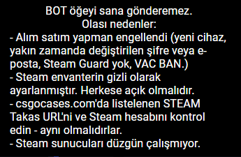 Şimdide bu hatayı vermeye başladı Steam URL'sini bilmem kaç kere kopyala yapıştırdım doğru olduğunada eminim, hesabımda da bir sürü oyun aldım yani ticaretede açık neden olmuyor anlamıyorum.
