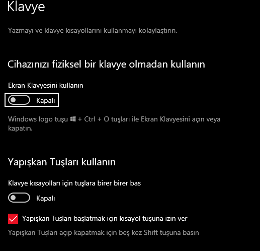 Windows arama çubuğuna "Erişim kolaylığı klavye ayarları" yaz, ayarlar alttaki gibi mi?