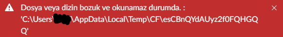 Önce CurseForge'yi silip tekrar yüklemeyi denedim ama olmadı. Sonra hatada belirttiği dizine gidip hata logu var mı diye bakacaktım ama temp klasörüne girmeye çalışınca görsel 2'deki hatayı aldım.