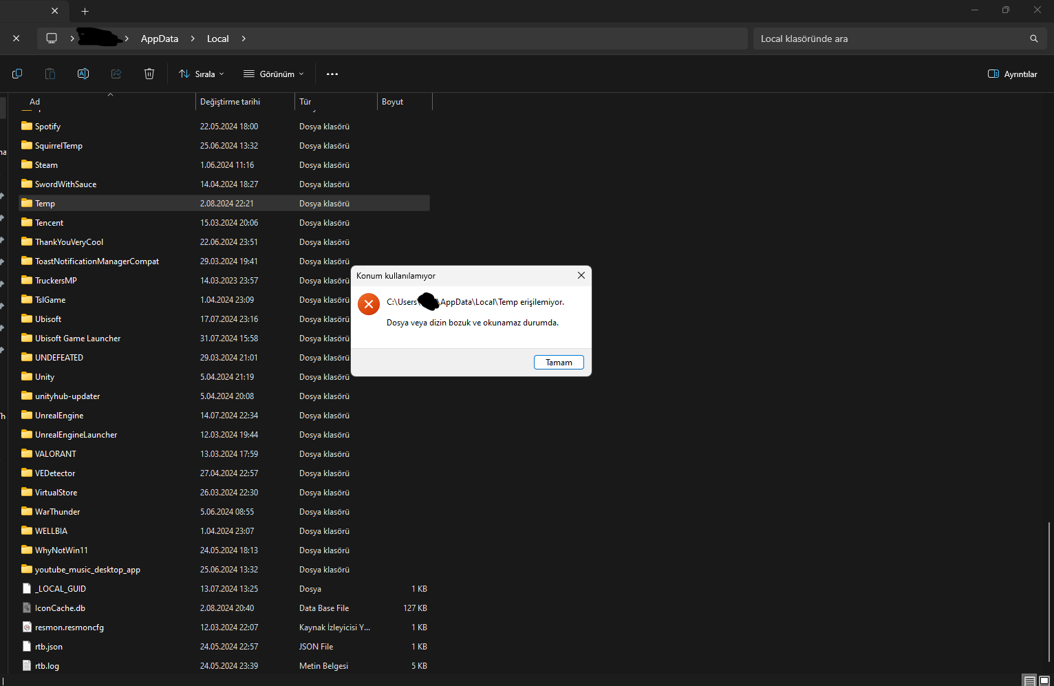 Temp klasörü ile ilgili hiçbir şey yapamıyorum. Çözümünü bilen ya da yardımcı olabilecek birisi var mı?