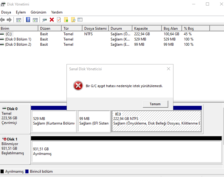Hata aldığım için YouTube'daki videolarda söylenen 'yeni basit birim' seçeneğine tıklayamıyorum disk 'başlatılmamış'da kalıyor.