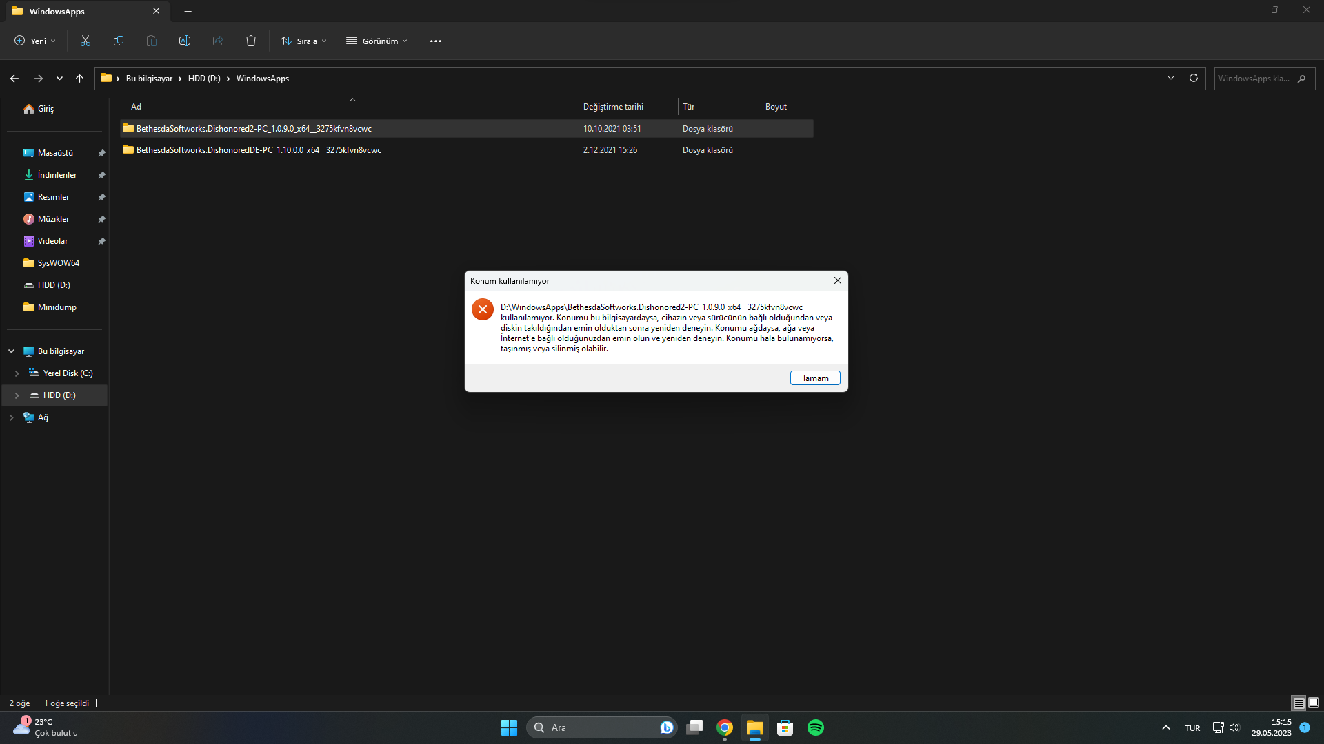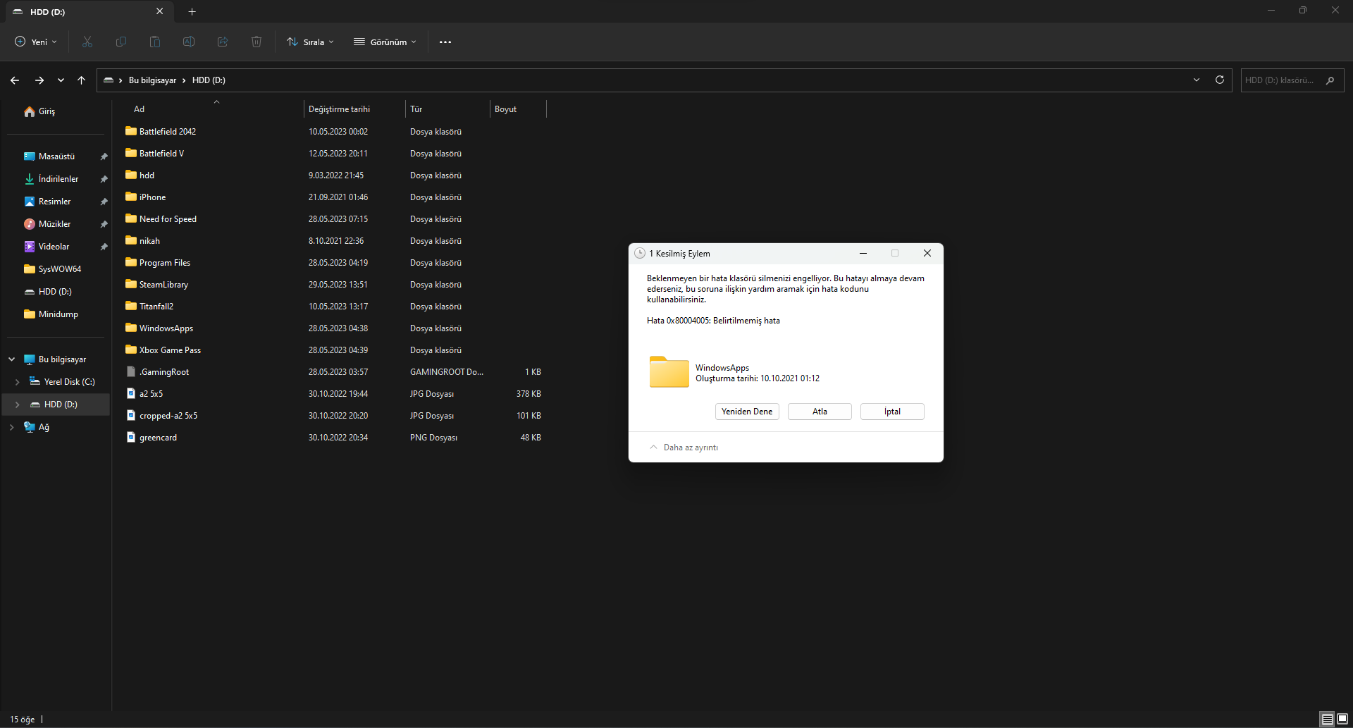 EK2: Ana klasörü silmek istediğimde karşılaştığım hata.