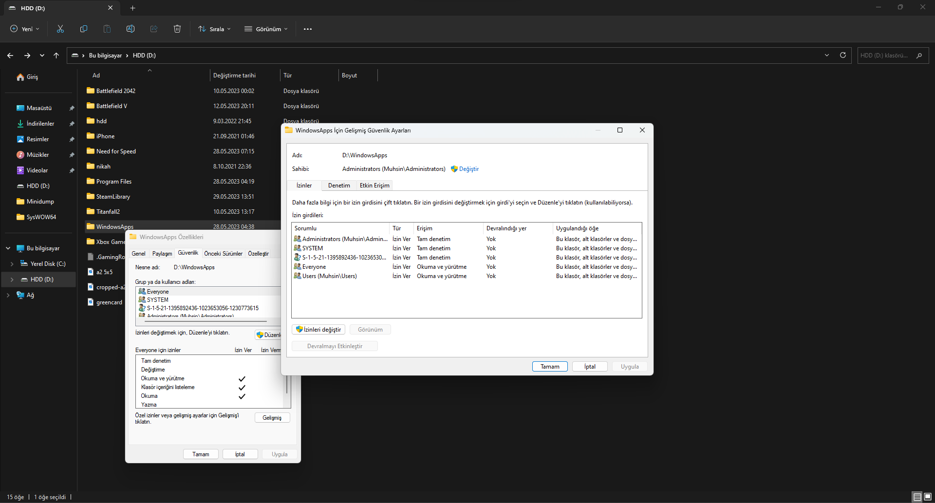 Merhaba arkadaşlar, bilgisayarıma format attım. D diskini silmedim içinde yedek dosyalarım olduğundan kaynaklı. Format sonrası D diskinin içindeki formattan önce kurulu olan Xbox Game Pass'ten yüklediğim oyunların klasörü mevcut, WindowsApps adında bu klasörü silmek istiyorum ancak silemiyorum. Bir türlü yönetici değişikliği yaptım yetkilendirme yaptım iobitLocker kullandım ancak yine de olmadı. Yardımcı olabilir misiniz?