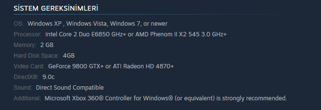 Orijinal Dark Souls'un sistem gereksinimleri. CS:GO'dan falan daha az sistem istiyor bu oyun. Dark Souls '2'yi GT 710'la oynuyordum ben. 4 GB RAM, Q8400 işlemci. Bunlara sistemi yetmeyen adam CS:GO'yu oynayamaz zaten ki ben GT 710 ile 50 FPS anca oynuyordum.