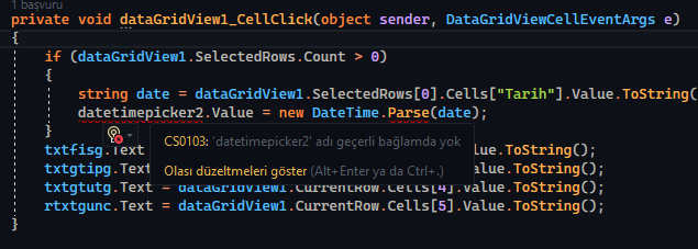 Hocam şimdi aklıma geldi projeye bakınca bu işlem datagridview içinde butona basınca seçili olan satırdaki verileri datetimepickera atayacak yani günlük veri değil seçili verinin tarihini datetimepicker da göstermesi gerek