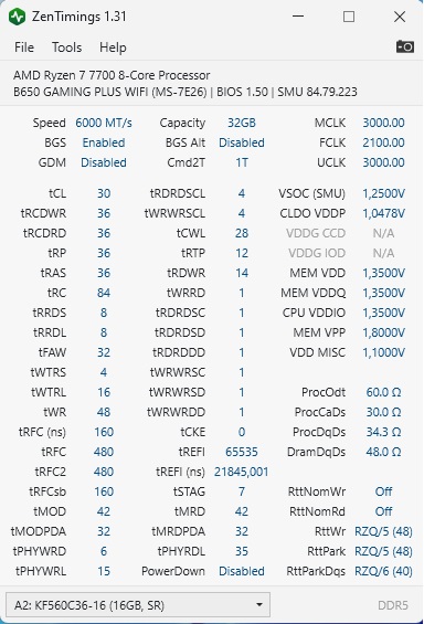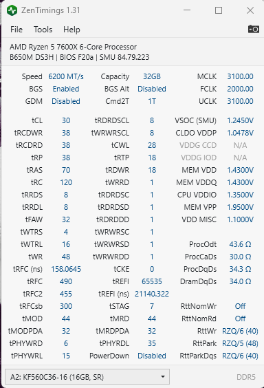 Ryzen 5 7600X, Gigabyte B650M-DS3H, RAM KF560C36bbek2-32