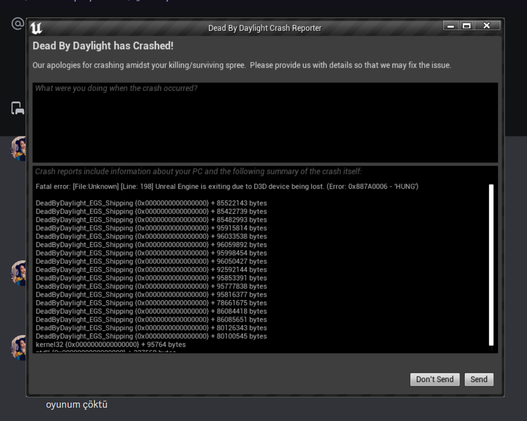 Hayır. Hala sorun devam ediyor mu bilmiyorum.Arkadaşlar 2 gündür DBD oynarken şu hatayı verip çöküyor. Yapabileceğim bir şey var mı?