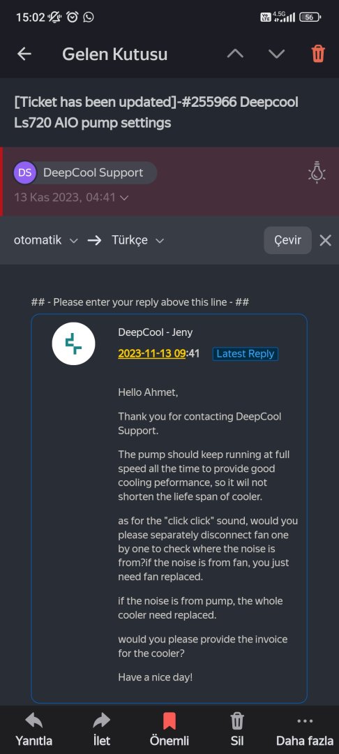 Şuanda deepcool dan e-mail bekliyorum hafta içi dönerler sanırım ona göre garantiden servise gönderebilirim.