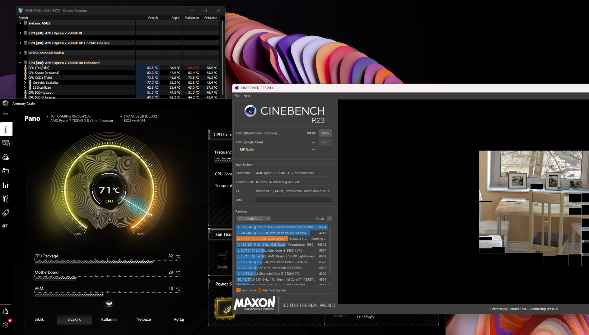 AMD Ryzen 7 7800x3D işlemci, MSI 4070 Super 3X Ventus ekran kartı kullanıyorum sıvı soğutmam da DeepCool LT720 360mm.