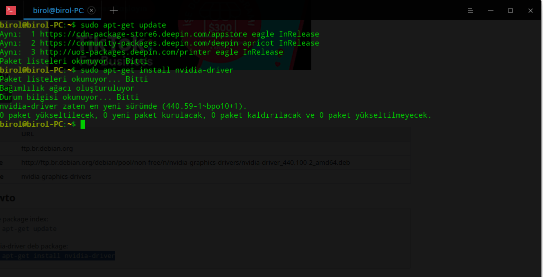 Merhabalar, gece gece canım sıkıldı ve yeni bir Linux dağıtımı denemek istedim. Deep'in görünüş olarak çok güzel geldi ve kurdum sistemime. Fakat NVIDIA Driver güncelleme rağmen işletim sisteminde bir yavaşlık bir stabilsizlik hissediyorum. Hardware İnfo'dan baktığım da herhangi bir NVIDIA ibaresi görmüyorum. Önceki Linux dağıtımlarında NVIDIA uygulaması bile olurdu ama bunda yok. Acaba ben mi yanlış düşünüyorum? Terminal görüntüsü de burada. Yardımcı olursanız sevinirim.