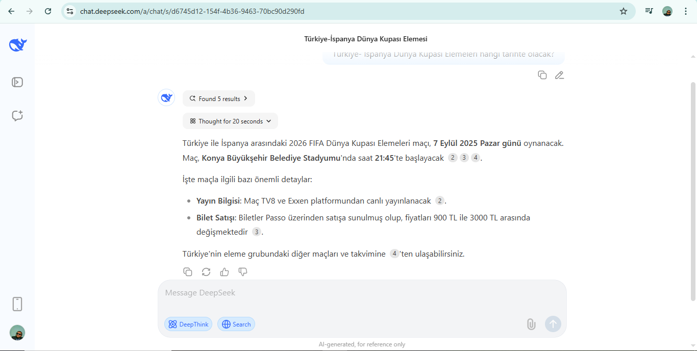 İlk öncelikle DeepSeek ile başlıyoruz, sonuçlar gördüğünüz gibi: