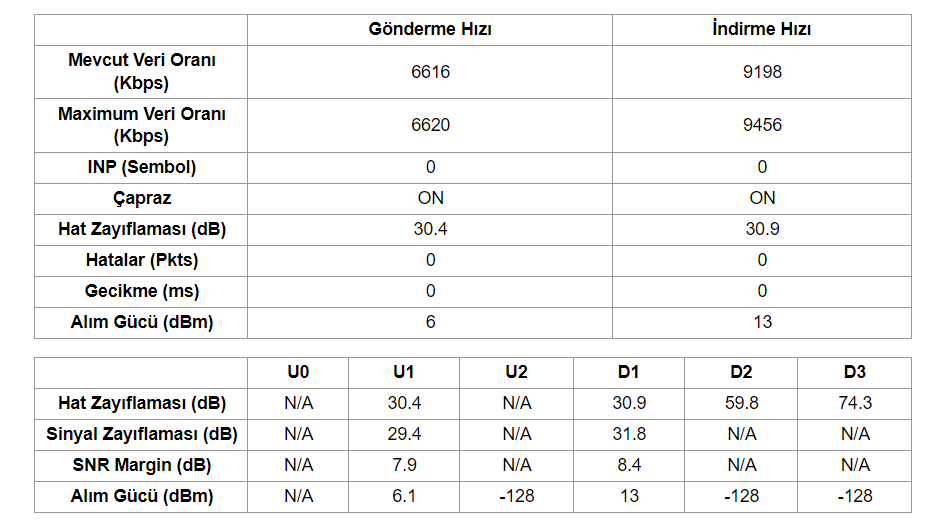 Ek olarak upload tarafı da sıkıntılı 6 Mbps upload hızında SNR değeri 8 dB. Hattın kontrol edilmesi gerekir.