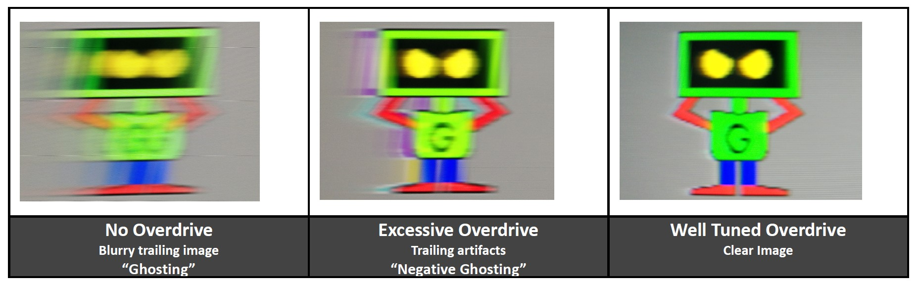 Overshoot; ghostingin tersi bir görüntü sorunudur. Paneli hızlandırdıkça pikseller önden gelmeye başlar. Ortada ki görüntü "negative g" olan overshoottur.