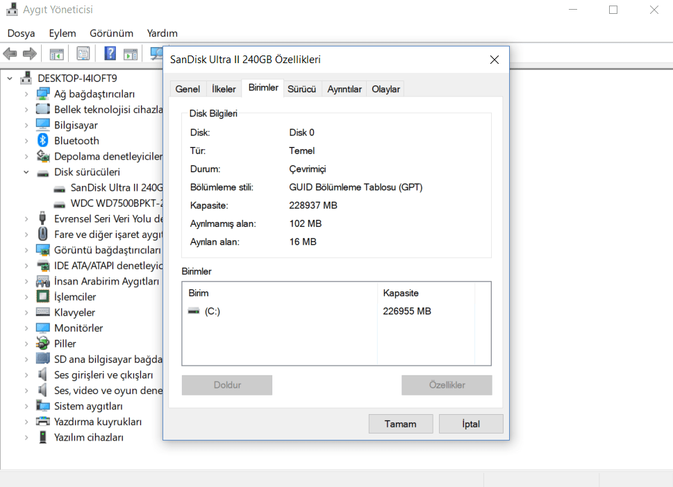 Bunun içi "Aygıt yöneticisi > Disk sürücüleri" Bölmesine geliyoruz. Buradan sisteminizi yükleyeceğiniz HDD'nin üzerine çift tıklayıp özelliklerini açın.