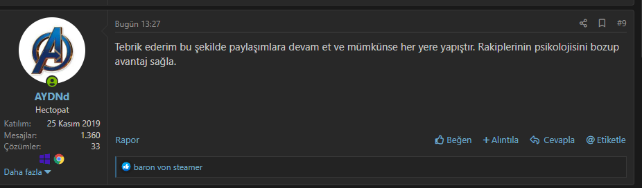 Kopya olabilir. Öğeyi denetle olabilir. Umrumda değil ki bu dediklerim olabilir. Burada önemli olan kimsenin psikolojisini bozmaya çalışamaz bu hoş bir emel değil. Belki ondan bile küçüksünüz daha yayınları bilmiyorsunuz. Kolay yayını fulleyeyim ego kasayım ne güzel. Kişilik meselesi. Ben hiçbir zaman hava atmadım iyi yaptığımda.Sınava tek kişi girmiş bile olsa yine aynı şeyleri söylerdim. Sınav puanı ile hava atabilir. Para ile almadığı sürece, kopya ile yapmadığı sürece fikrim değişmez. Keşke herkes bak ben de yaptım ne olmuş diyebilse. Yani forumda bugün 1000 kişi bak ben de 500 tam puan yaptım emeğimle diye konu açsa etiketlesin tek tek tebrik ederim. Sınav kolaymış 1 kişi 1000 kişi girmiş ben ona bakmıyorum. Hepsin de ayrı ayrı emek mevcut. Tek umurumda olan kopya ve para ile yapılmamış olması.
