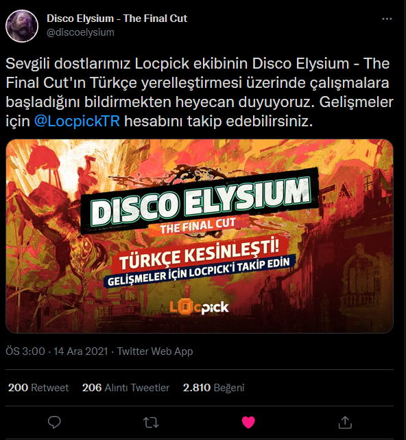 Ay ay çevirinin durumu hakkında bilgi vereceğiz dediklerine göre en az 5-6 ay sürer gibi geldi bana. Normal bir oyun değil çünkü Disco Elysium, bundan dolayı çevirisi uzun sürecektir.Sonunda ya oyunu satın almış bekletiyordum Steam'de. Bu çalışma tahmini ne kadar sürer bir öngörüsü olan var mı ?