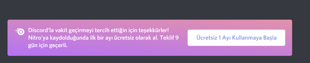 İlk 1 ay bedava. Yani sonraki aylarda parasını vereceksiniz.Merhaba Discord'a girdiğimde bedava Nitro aboneliği bildirimi geldi. Ama kullanmaya dediğimde normal Nitro alır gibi para istiyor nasıl bedava alabilirim?