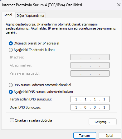Videoda 208 ile başlayan dns kısmına üste 1.1.1.1 alta 1.0.0.1 yazın.