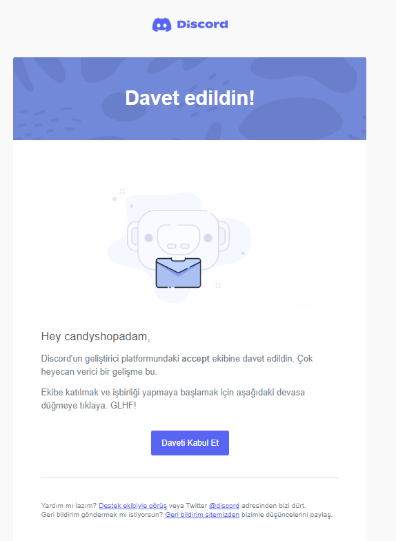 Daha sonra mail adresime discord.com'dan Discord geliştirici ekibine davet edildin diye bir mail geldi ve daveti kabul et butonu bulunmaktaydı. Tıklamadım.