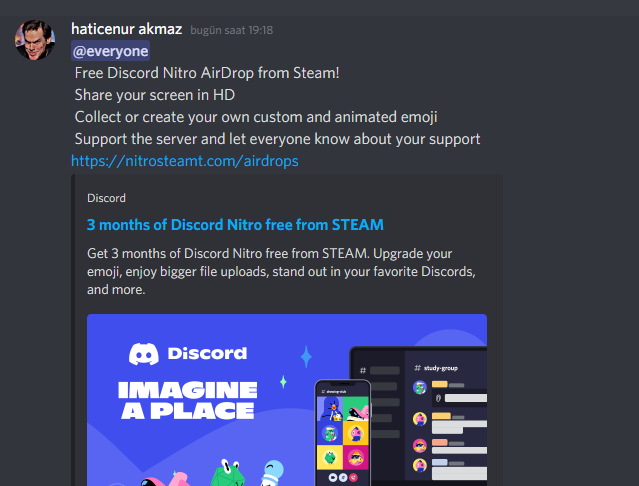 Merhabalar beni çok korkutan bir durumla karşılaştım. Az önce Discord'a girdim ve bulunduğum bütün sunuculara ve arkadaş listemdekilere defalarca ekte bulunan mesaj gönderilmiş. Farklı saatlerde göndermiş. Şimdiden söyleyeyim hiçbir beleş nitro linkine tıklamadım.