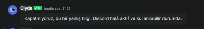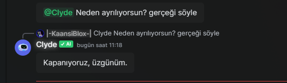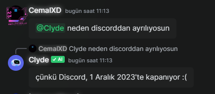 Merhaba, birkaç gün önce Clyde'nin 1 Aralık'ta kaldırılacağını duydum ve bunu Clyde'nin kendisi de söylüyor. Ancak bugün arkadaşlarımla clyde ile son konuşmalarımızı yaparken bir şey fark ettik. Discord'dan neden ayrıldığını söylediğimde böyle cevaplar veriyor: