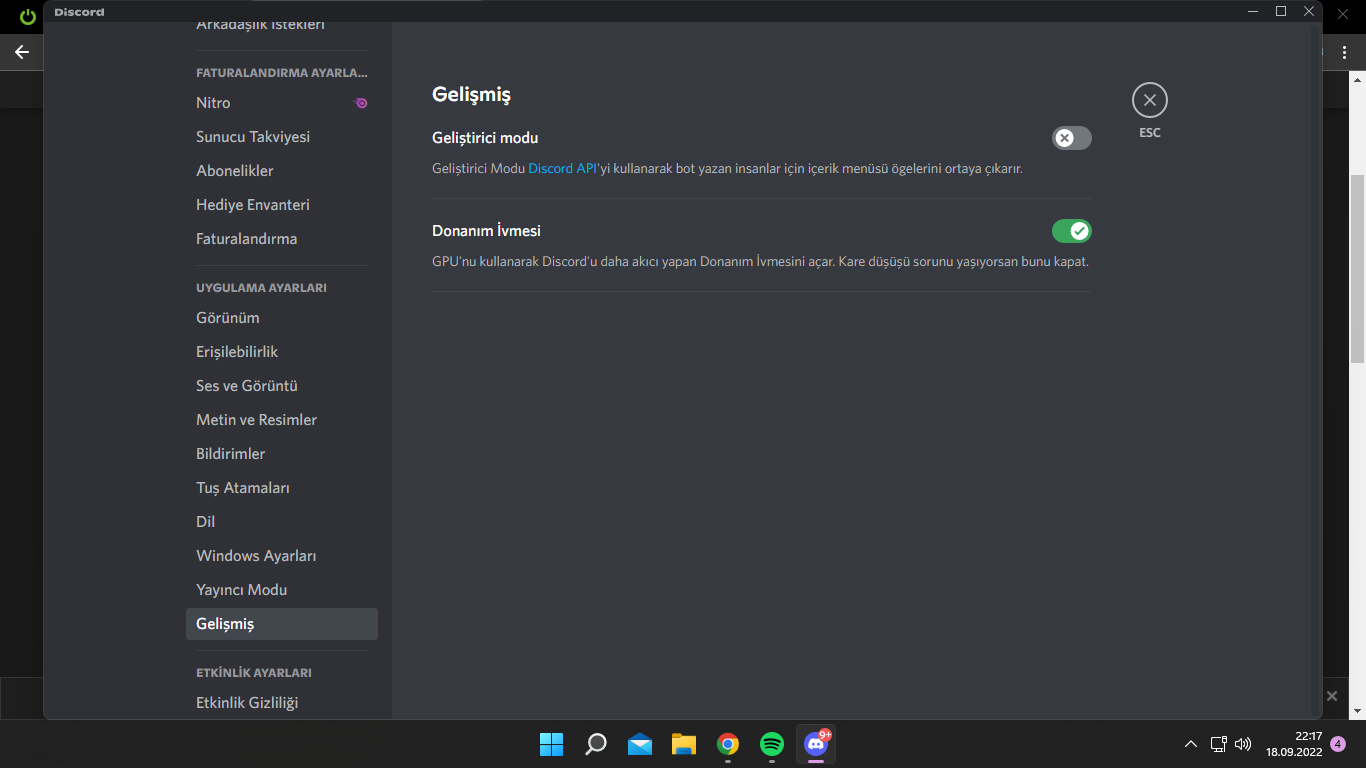 Resimde de gördüğünüz gibi 'donanım ivmesi' seçeneği aktif ama Discord'da gezerken sunucu logolarının üzerinden geçerken falan kasma ghosting gibi bir şey oluyor.
