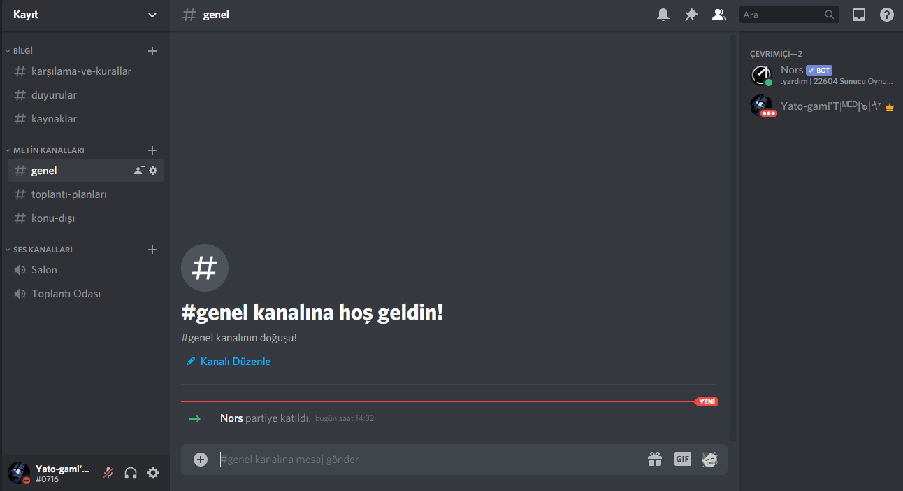 Şimdi ise herhangi bir metin kanalına fotoğraftaki komutu giriyoruz.