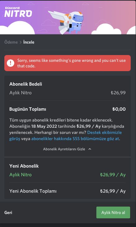 Discord Nitro alırken 1 haftadır böyle bir sorun gözüküyor. VPN ile denedim, başka hesapla ve başka Nitro kodu ile denedim yine aynı. Bu nasıl düzelecek?
