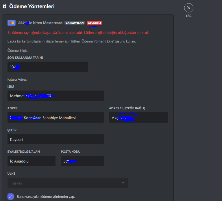 Kullanıcı Ayarlarında "Faturalandırma" var. Faturalandırma kısmından, kullanmaya çalıştığın ödeme yöntemini silip tekrar eklemeyi/satın almayı dener misin?