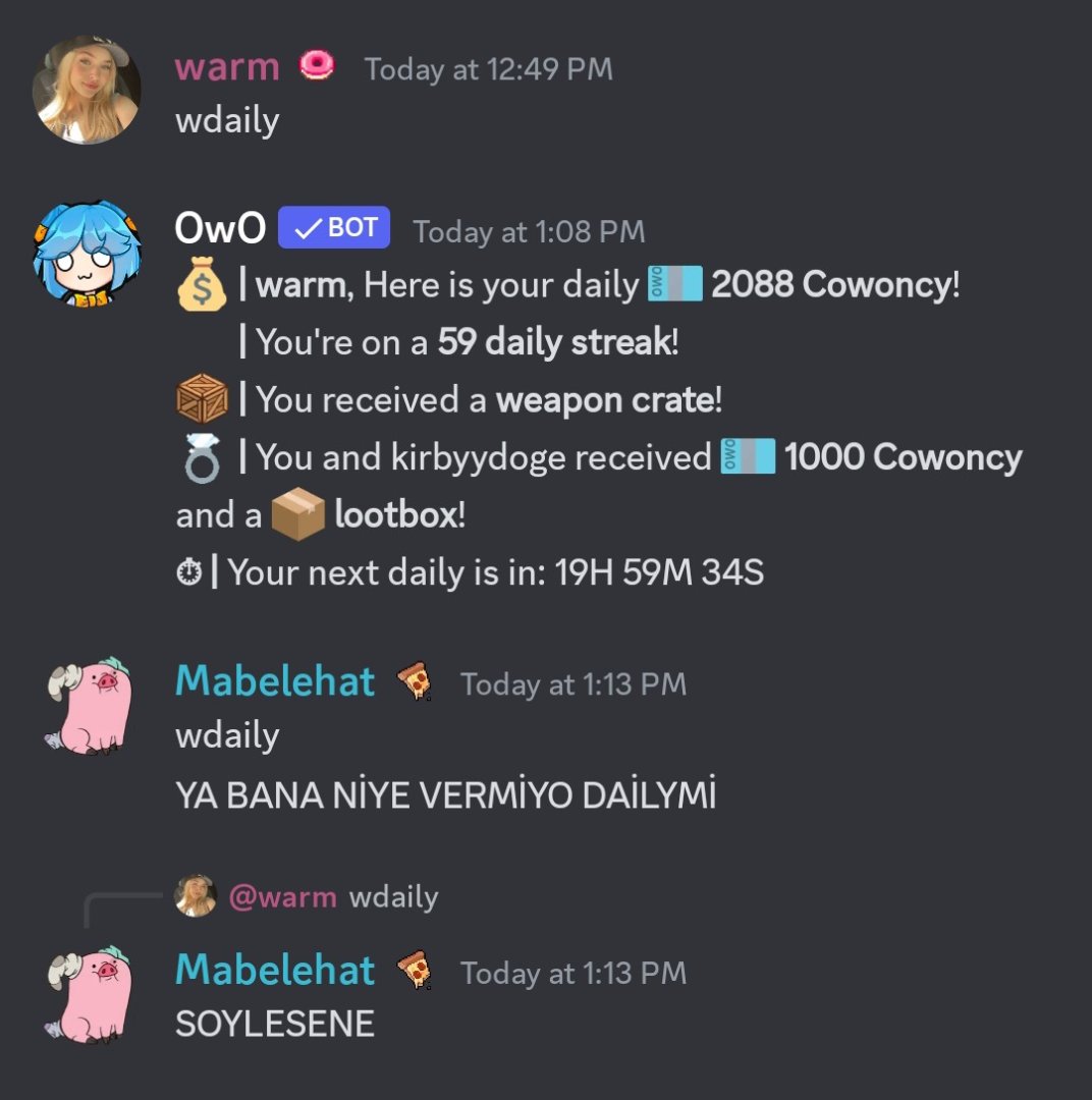 Arkadaşlar Discord'da OwO botunda 70 günden fazla daily streak'im var. Bugün günlük hediyemi almaya girdiğimde "wdaily" komutunu yazmama rağmen vermedi. Botun çökmüş olabileceğini düşündüm ama diğer arkadaşlarım oynuyordu. Ben hiçbir OwO komutuna cevap alamıyorum. Streak'imi kaybetmek istemiyorum çözümü var mıdır?
