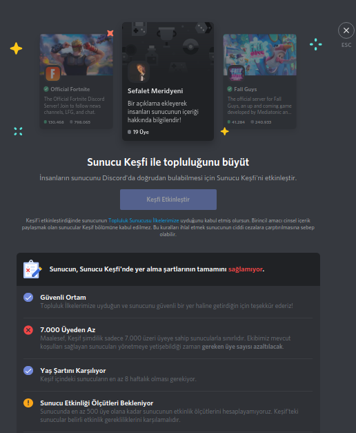 Topluluk sunucusu yapmak arama kısmına girmek için yeterli değil. Sunucu ayarlarında "Keşif" adı verilen bir kısım var. Keşif için yeterlilikleri sağlıyor iseniz başvuru yapıyorsunuz ve arama yerine ekleniyorsunuz.Arkadaşlar, Discord sunucumu topluluk sunucusu yaptım ama arama yerine sunucumun adını yazdığım zaman gözükmüyor. Topluluk sunucusu yok diyorum. Yardım edebilir misiniz? Teşekkürler.