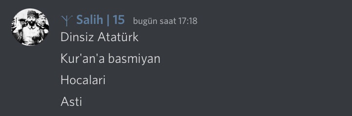 Atatürk'e ciddi hakaretlerde bulunan bir arkadaşı biz şikayet etmiştik. Herif çizgiyi o kadar aştı ki içimizden “seninle uğraşmayanın (…)” diyorduk, ardından şikayette bulunduk ve şikayette bulunan arkadaşımızın telefonuna işlem başlatılmıştır diye bilgilendirme mesajı gelmiş söylediğine göre. Bilmiyorum kim ilgileniyor ama yaşadığımı anlatıyorum. Hatta aşağıda vereyim çocuğun ithamlarını, gerçekten tiksindirici şeyler yapmayın bunları.