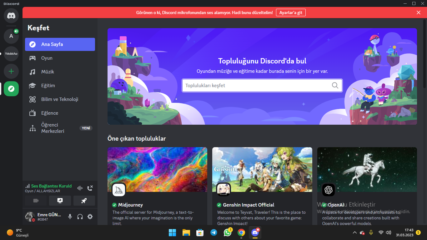 Windows üzerinden izin verdin mi? Discord ses ayarlarından doğru mikrofon aygıtını seçtiğinden emin misin?